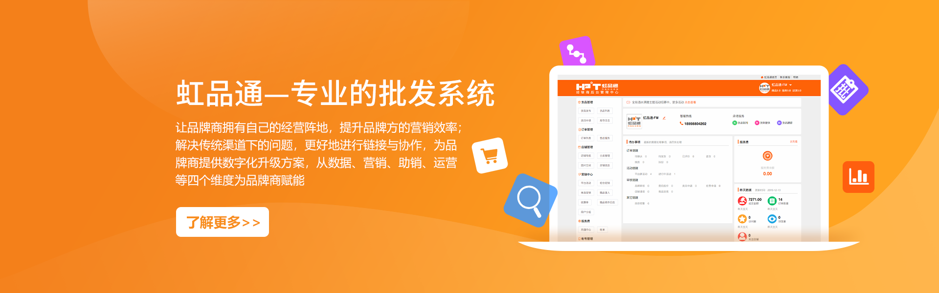 南寧虹品通軟件科技有限公司成立于2014年,是一家開發(fā)軟件技術(shù)服務(wù)公司。公司總部位于中國綠城南寧市,專注軟件行業(yè)系統(tǒng)支持和供應(yīng)鏈大數(shù)據(jù)開發(fā),并將其應(yīng)用于商業(yè)領(lǐng)域。掌握供應(yīng)鏈系統(tǒng)研發(fā)、商品流通大數(shù)據(jù)、批發(fā)零售商城等核心技術(shù),并持有多項(xiàng)技術(shù)專利和著作權(quán)。公司致力于幫助生產(chǎn)廠家、商品流通、銷售型企業(yè)向互聯(lián)網(wǎng)化轉(zhuǎn)型升級(jí),利用互聯(lián)網(wǎng)獲取客戶、洞察市場、服務(wù)客戶